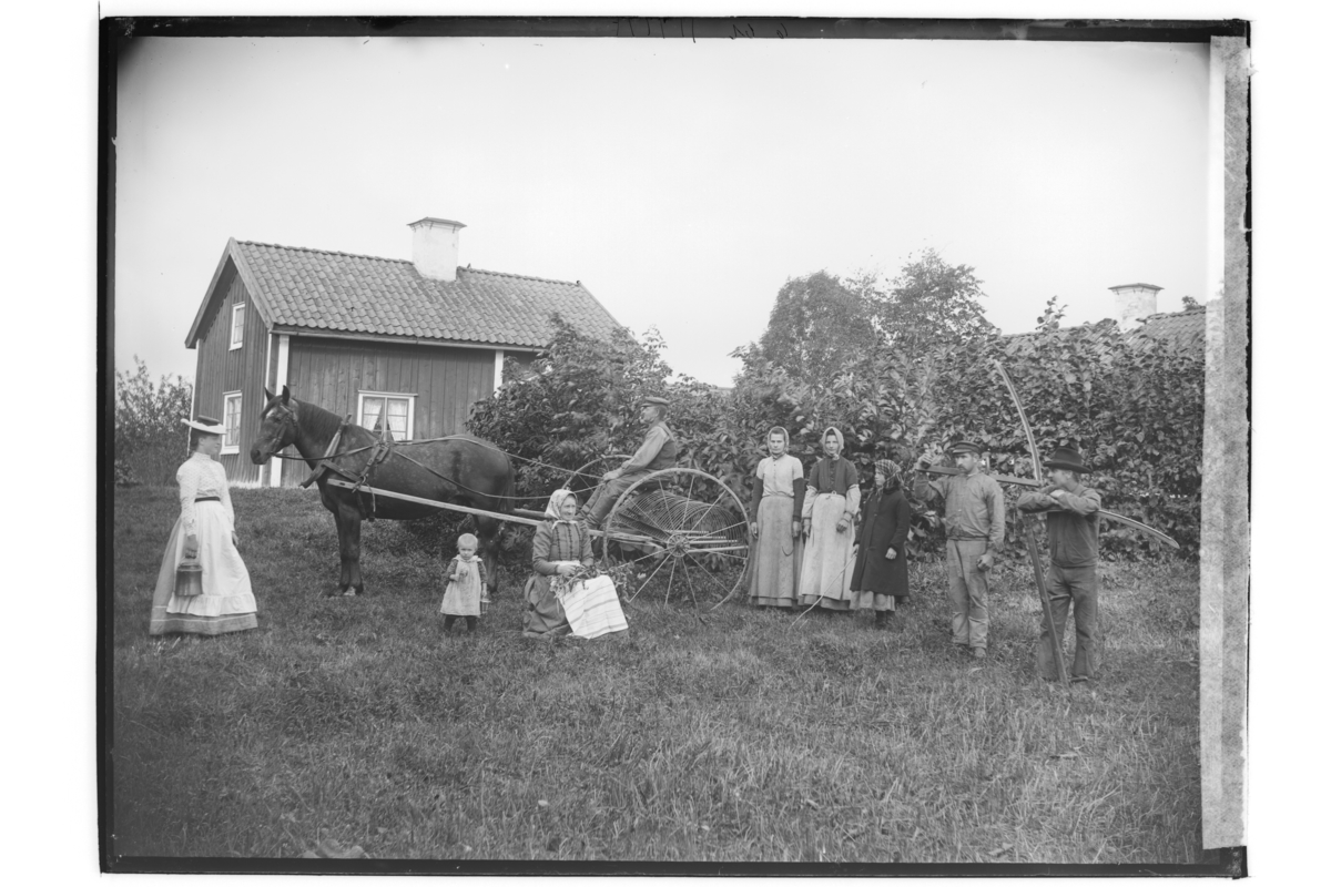 Bostadshus, 9 personer, skördefolk. Häst med höräffsa.