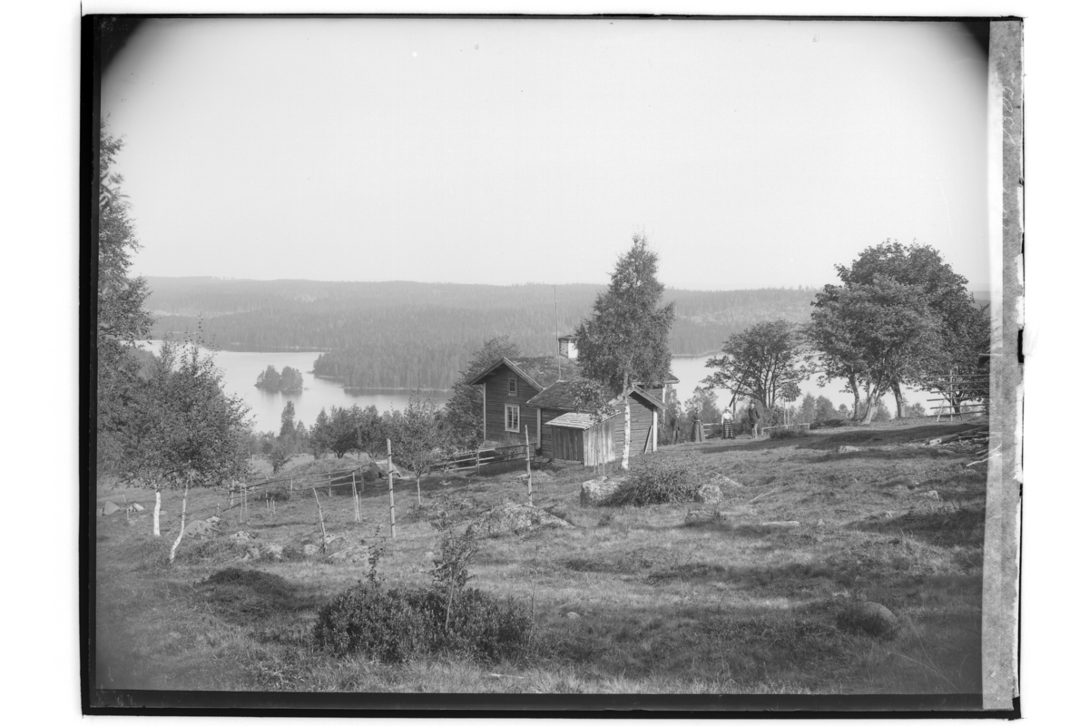 Envånings bostadshus med torvtak, 4 personer till höger om stugan.