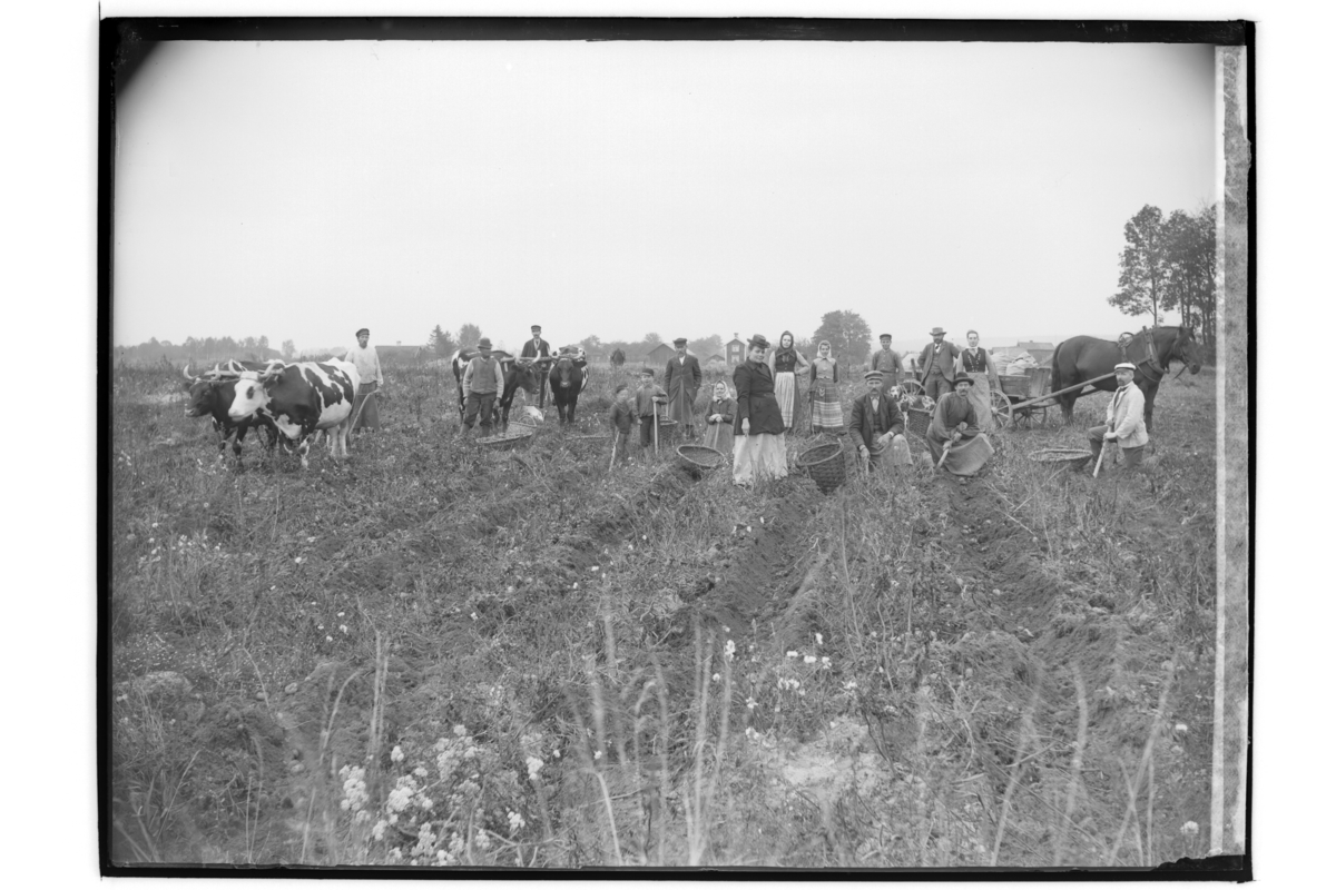 Potatisplockning, 16 personer, 2 par oxar, en häst.