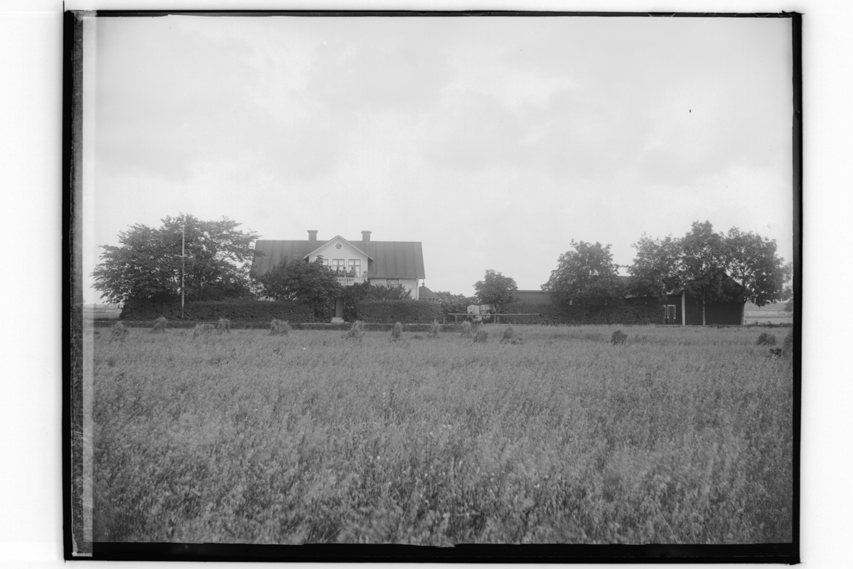 Tvåvånings bostadshus med balkong, ekonomibyggnader. 6 personer på balkongen, en man med en häst.
