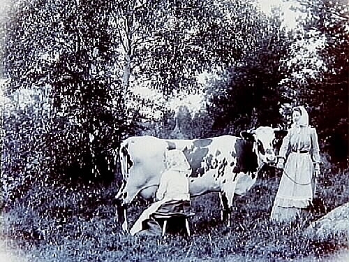 Handmjölkning, en ko och två kvinnor.