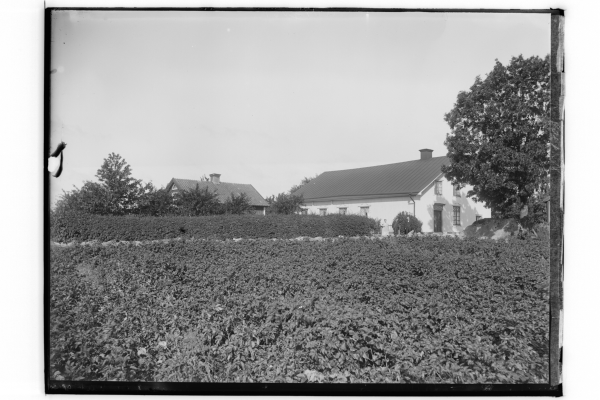 Envånings bostadshus med inredd vind, tre personer framför huset.