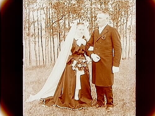 Brudpar, bruden i svart klänning, vit slöja, krona, brudgummen i frack.