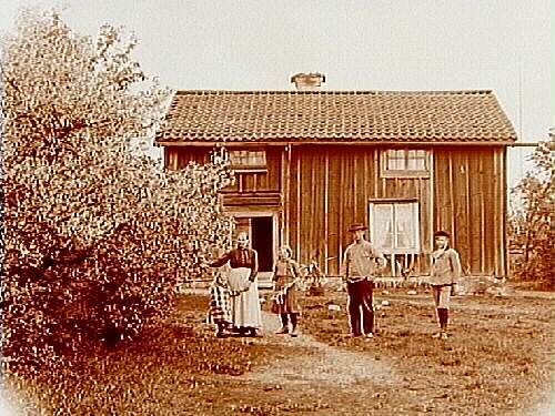 Tvåvånings enkelstuga, familj 5 personer framför stugan.