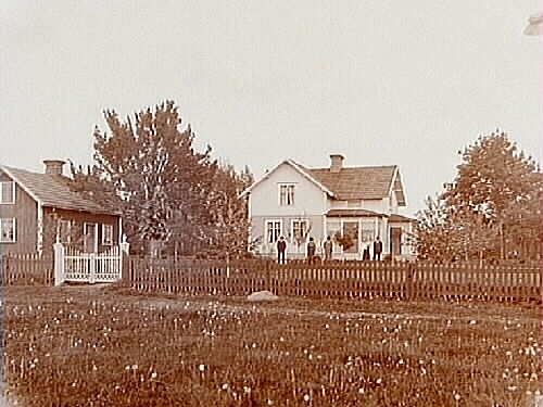 Envånings bostadshus. 5 vuxna och ett litet barn framför huset.