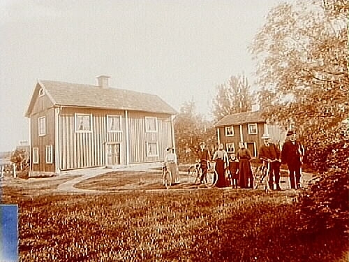 Ett tvåvånings bostadshus, en tvåvånings enkelstuga. 7 personer vid rundeln framför husen, därav 3 personer med cyklar.