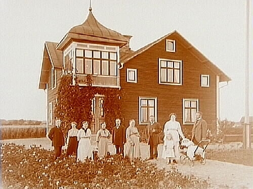 En och en halvvånings bostadshus, vinkelbyggt, med glasat torn.
