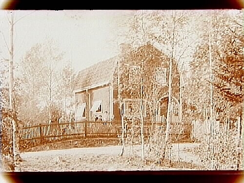 Tvåvånings villa med brutet tak, familj 4 personer framför villan.