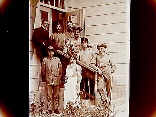 Titel: En läkare, en sjuksyster och sex soldater vid sjukhustrappan. 119/5 Andersson, Grenadjärerna, I3, Örebro.