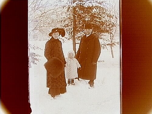 Familj, 3 personer på vinterpromenad.