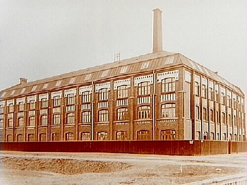 AB Skofabriken Skandia, tvåvånings fabriksbyggnad i tegel, vinkelbyggt, med brutet tak.