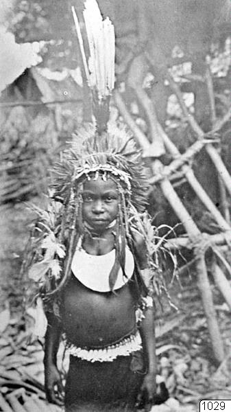 Motiv: Flicka som är cermonialklädd för att få bandet för perinaeum. Lokal: Brittiska Nya Guinea. Foto för skioptikon. Foto: Fotograf okänd, datum okänd. Erh: gm. köp av Dr. W. Kauderns bildmaterial, 1947. Publ. Robert W. Williamson: The Mafulu, Mountain People of British New Guinea. London 1912. Fig. 71, mellan pp. 234 o 235.