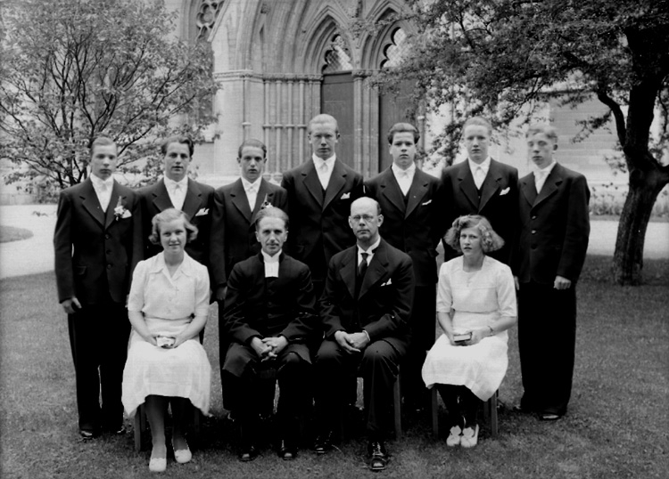 Dövstumma konfirmander, 7 pojkar, 2 flickor, pastor Svennas och en man.