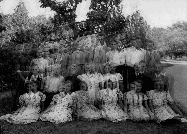 Almby Folkskolan, 20 skolbarn med lärare på skolgården.