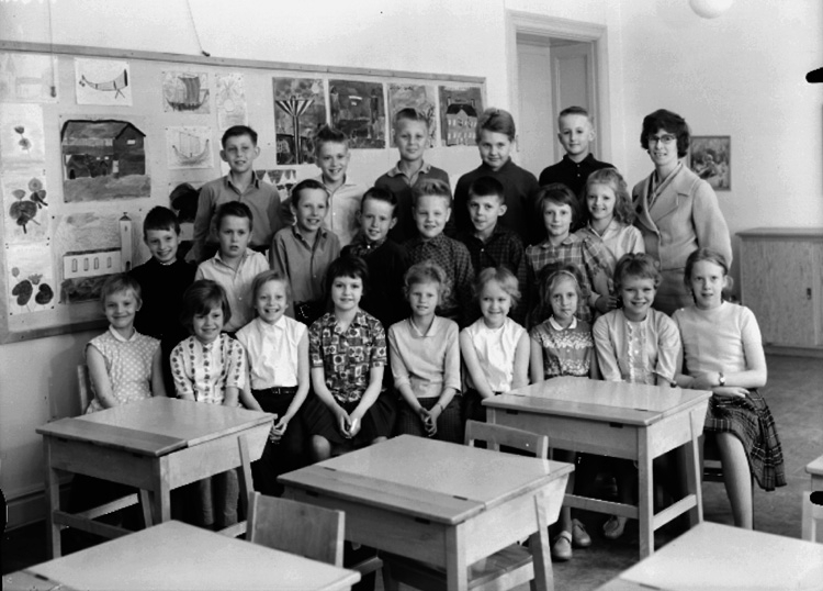 Stureskolan, klassrumsinteriör, 22 skolbarn med lärarinna fru Marianne Christensson.