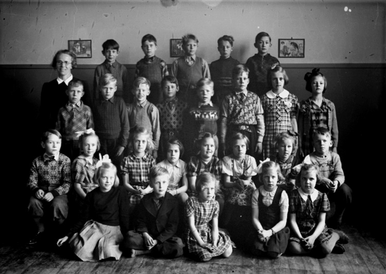 Vasaskolan, klassrumsinteriör, 26 skolbarn med lärarinna fröken Märta Ljungdahl.