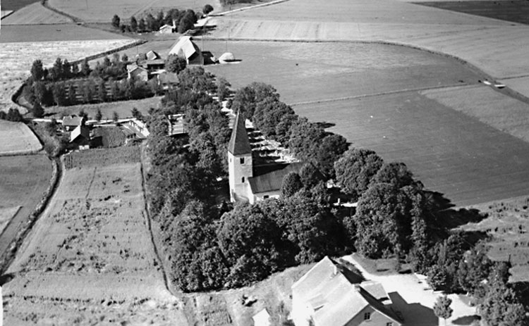 Flygfoto över Hardemo, kyrkan och bostadshus.