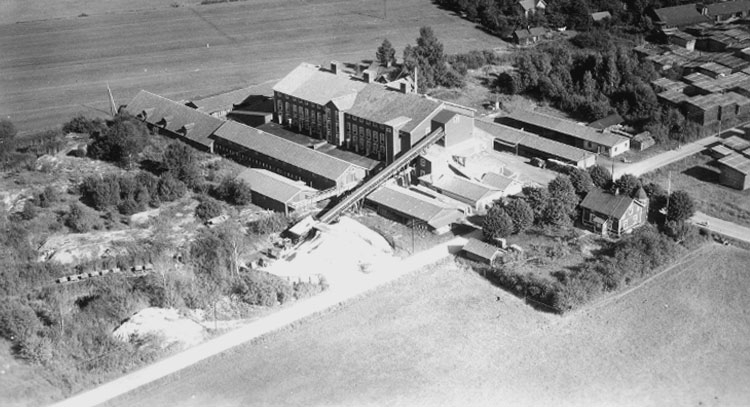 Flygfoto över Hallsbergs sågverk.