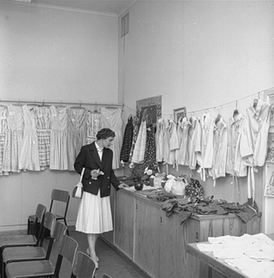 Bångbro skola, examen i slöjden. Klassrumsinteriör, en kvinna.