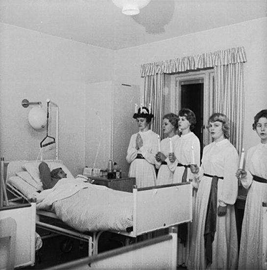 Luciafirande på Tallmogården (ålderdomshem), rumsinteriör, en äldre kvinna i sängen.