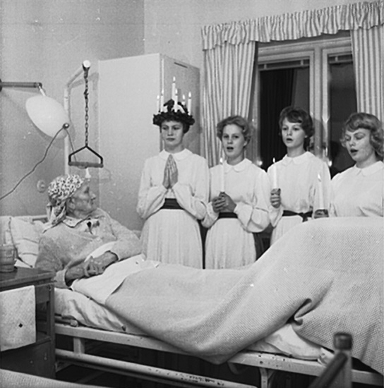 Luciafirande på Tallmogården (ålderdomshem), rumsinteriör, en äldre kvinna i sängen.