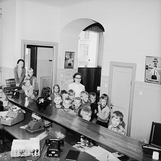 Sparbanken i Kopparberg, interiör, skolklass på besök.