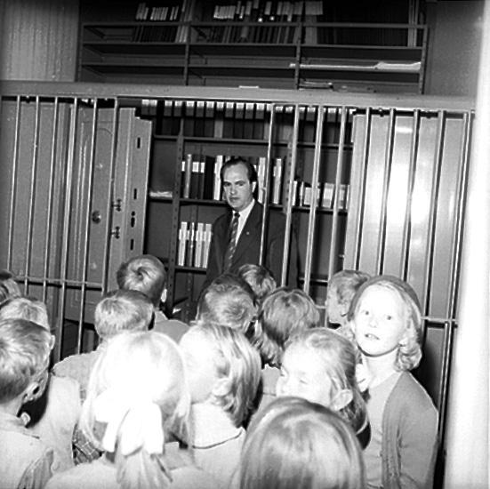 Sparbanken i Kopparberg, interiör, skolklass på besök.