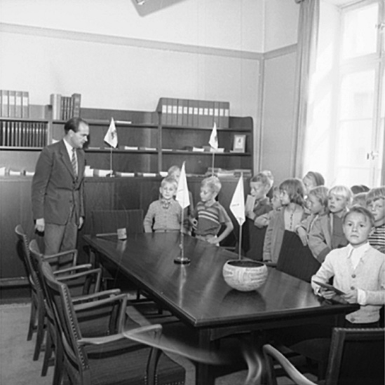 Titel: Sparbanken i Kopparberg, interiör, skolklass på besök.