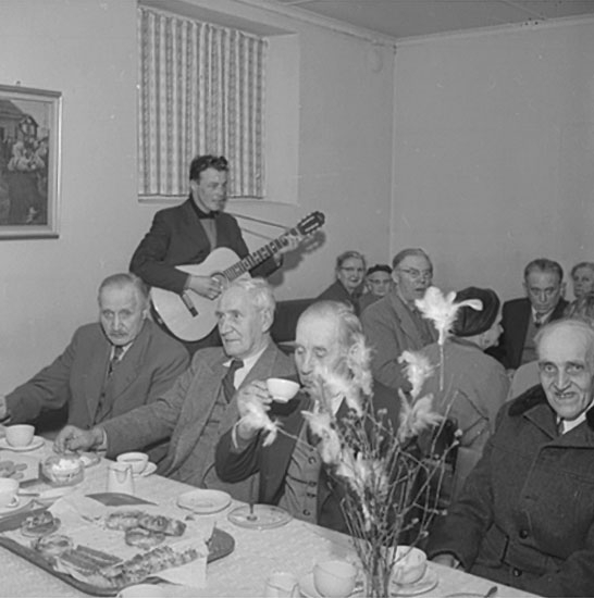 Titel: Bredsjö Pensionärsförenings årsmöte, interiör, grupp vid bordet.