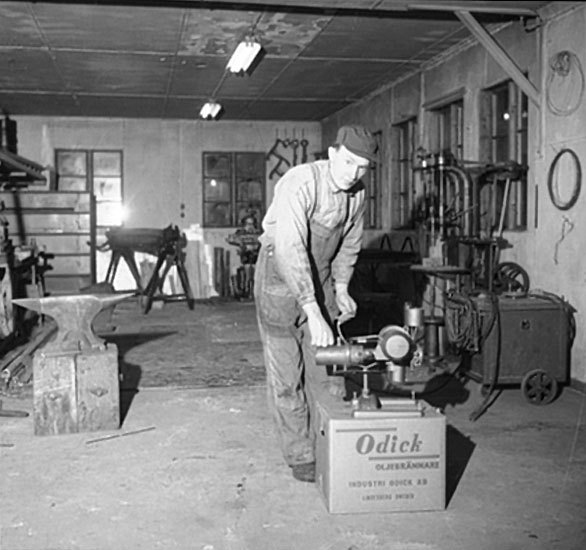 Verkstadsinteriör, en man.