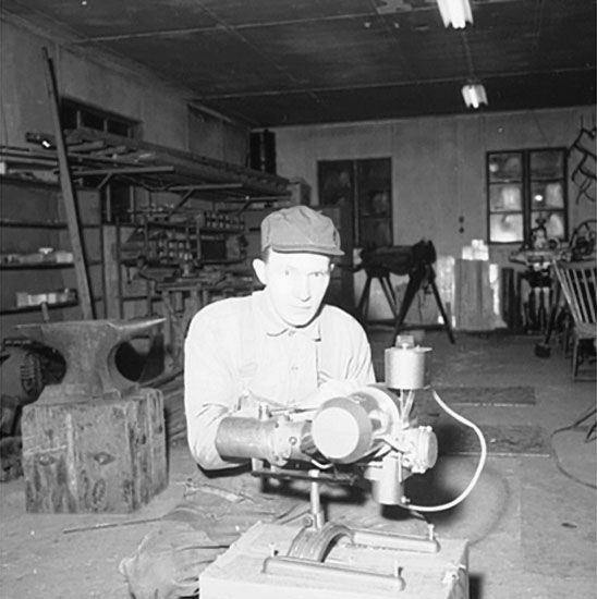 Verkstadsinteriör, en man.