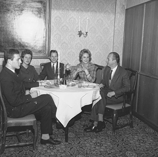 Nyårsfirande på hotell Laxbrogården, grupp fem personer vid bordet.