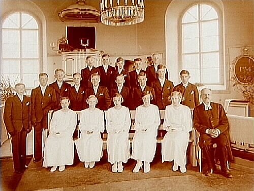 Konfirmander, 5 flickor, 14 pojkar och kyrkoherde Morén.
