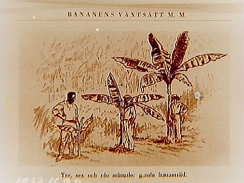 Bananodling, bananens växtsätt, tre, sex och nio månader gamla bananträd.