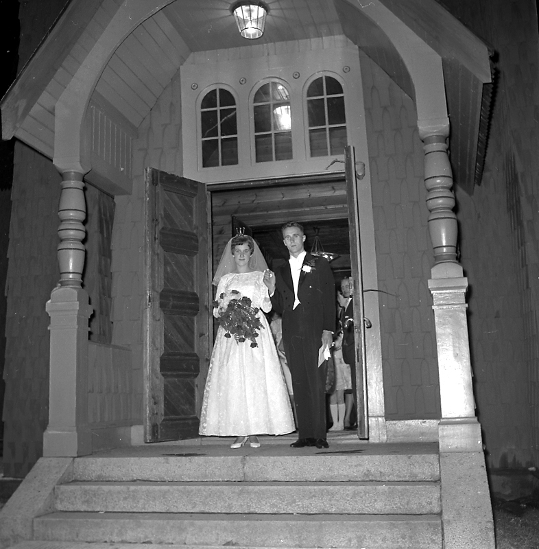 Bröllop i Ljusnarsbergs kyrka, brudpar framför kyrkan.