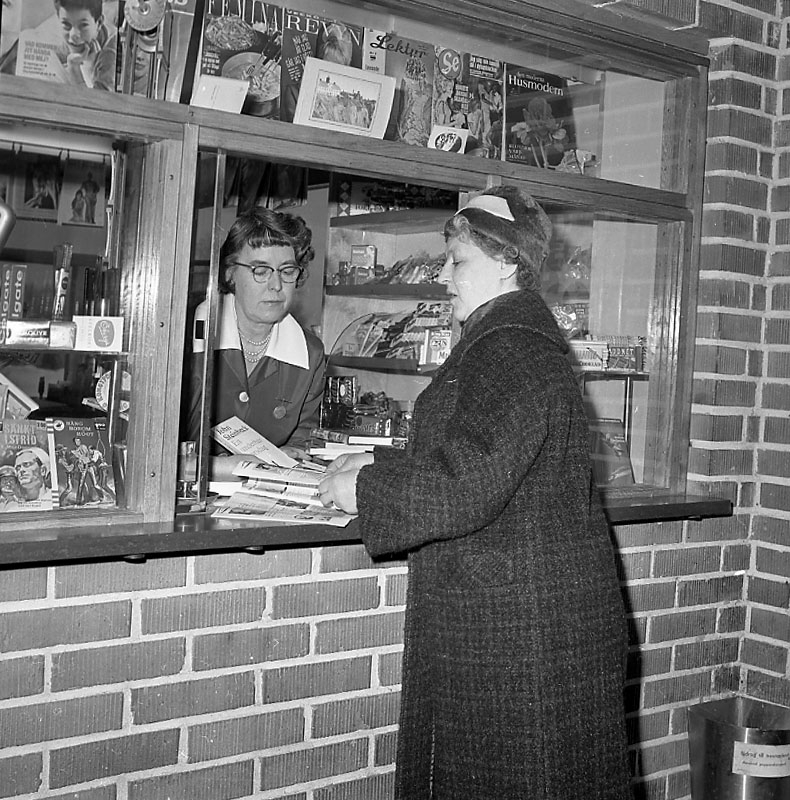 Titel: Pressbyrån i Ställdalen, två kvinnor. Fru Leonardsson med kunden fru Fjälling.