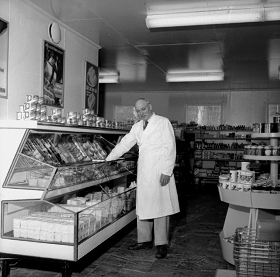 Invigning av övre Konsum i Ställdalen (numera rivet). Affärsinteriör, en man ur personalen.