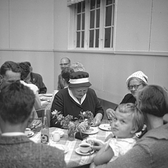 Titel: "Lördagskväll" vid Lillängsgården, grupp vid bordet, kaffedrickande.
