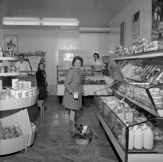 Invigning av övre Konsum i Ställdalen (numera rivet). Affärsinteriör med kunder och personal.