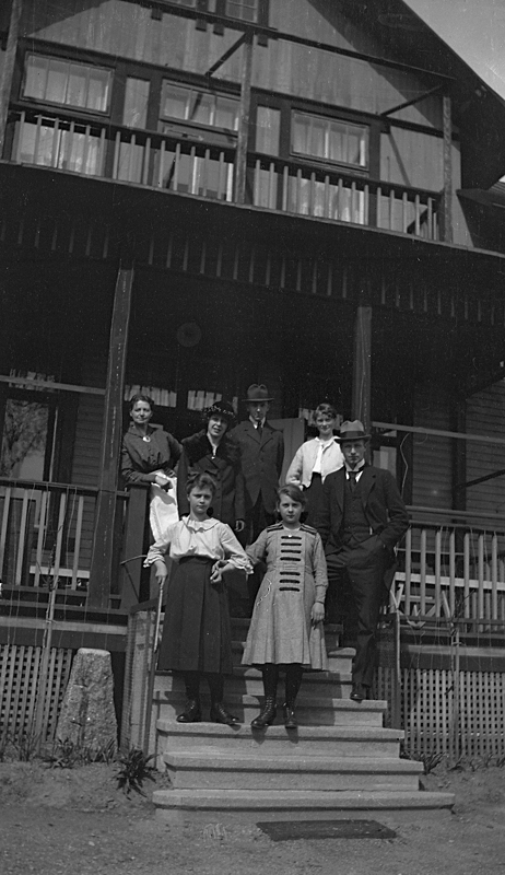 Bostadshus, familjegrupp sju personer framför huset.