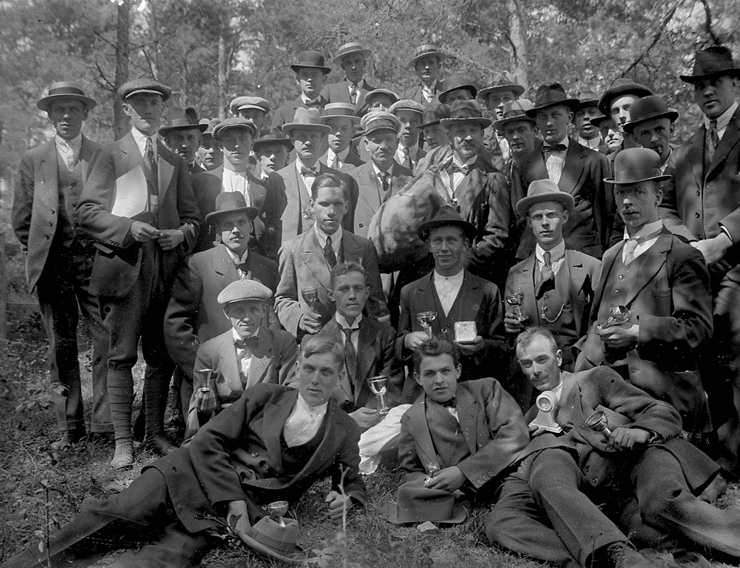 Titel: Typografernas idrottstävlingar. Grupp med idrottspriser (pokaler). Karl Hedström, m.fl.