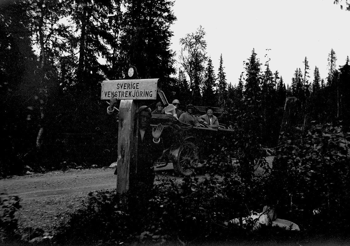 Gränsmärke, skylt med texten: "Sverige, venstrekjöring". En person vid skyltet, några personer i en bil.