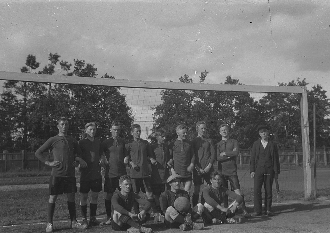 Typografernas idrottstävlingar, idrottslag (fotbollslag) framför målet.