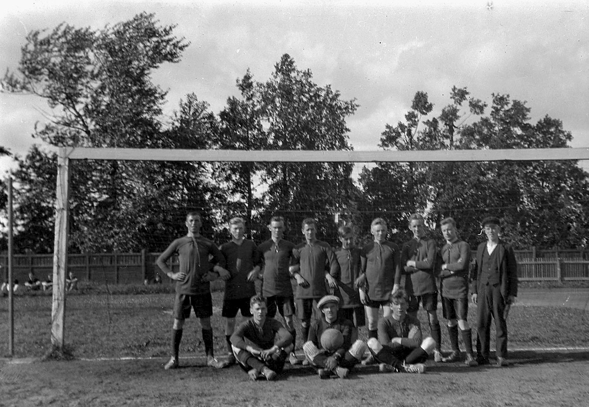 Typografernas idrottstävlingar, idrottslag (fotbollslag) framför målet.