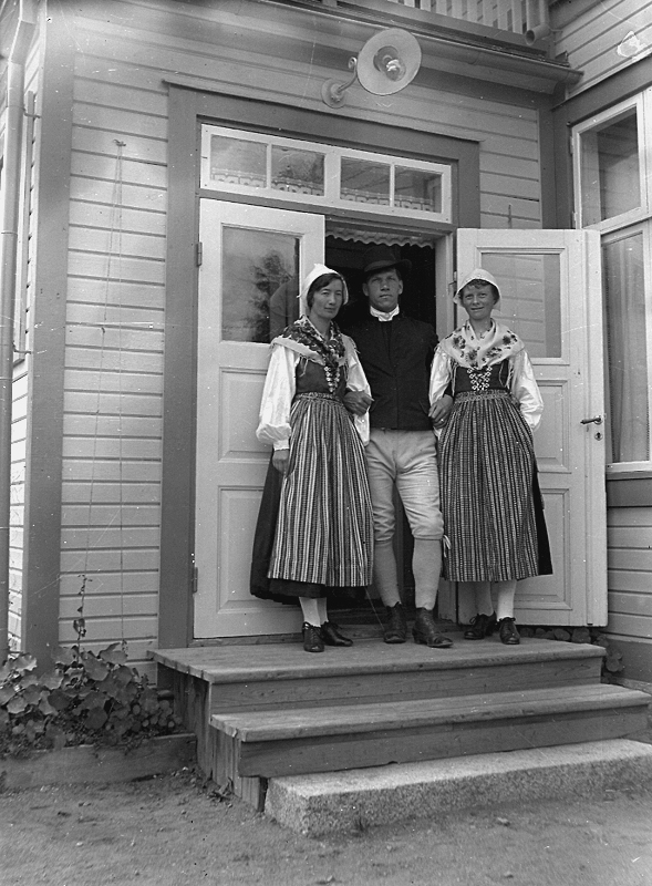 Bostadshus, en man och två kvinnor i folkdräkt på trappan.