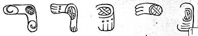 Exempel på hieroglyfförenkling. Karakteristiska element kvar, här korsade banden. BAE-B. 57. Fig. 10. Sk. 1-53. Detaljer till mayabildskrift om fickräkning o dyl. Bilderna efter S. G. Morley: An introduction to the study of the Maya hieroglyphs.