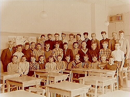 Almby Södra skola, klassrumsinteriör, 35 pojkar med lärare Albert Johansson, klass 8H, sal 2.