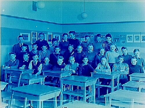 Engelbrektsskolan, klassrumsinteriör, 28 skolbarn med lärare Arne Åhman, klass 6J, sal 2.