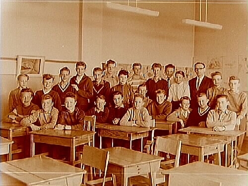 Olaus Petriskolan, klassrumsinteriör, 24 pojkar med lärare Folke Björk, klass 8B, sal 28.