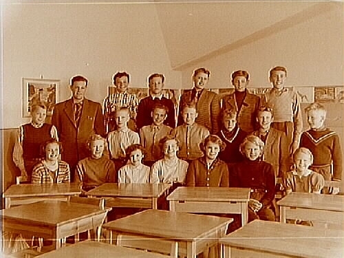 Olaus Petriskolan, klassrumsinteriör, 19 skolbarn med lärare Gunnar Norlin, klass 6Aa, sal 37.
